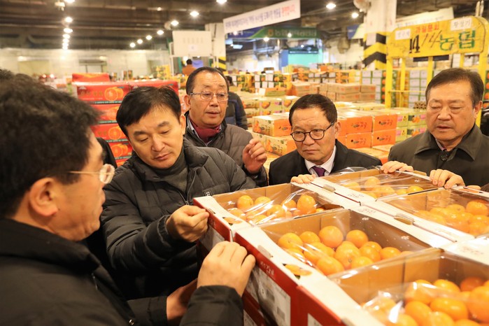 원 지사는 이날 현장을 찾아 제주감귤 유통 현장을 직접 돌아보고 경매사와 중도매인 등 도매시장 관계자도 격려했다.