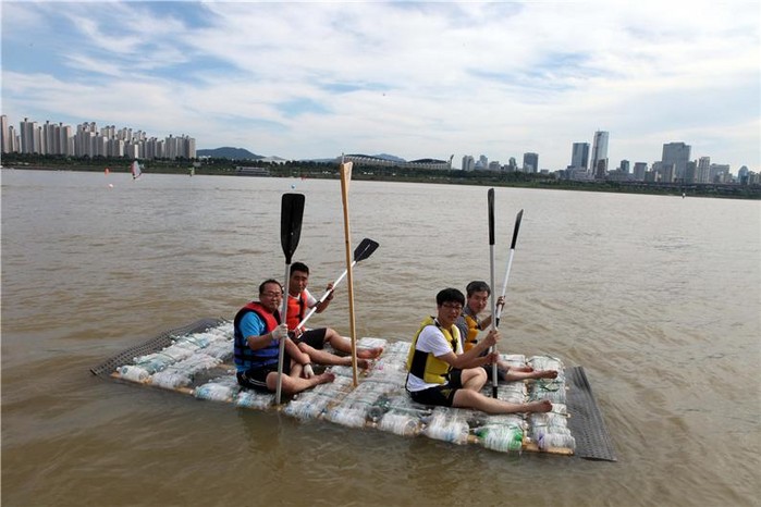 | ▲ 한국환경체육청소년서울연맹 운영위원들이 지난 3일 '제1회 한강 페트병 뗏목건너기' 대회를 앞두고 뗏목을 만들어 실전 테스트를 하고 있다. 사진 왼쪽 앞쪽부터 시계방향으로 박영복 홍보이사, 박환희 사무총장, 황정익 사무국장, 이동민 연맹 차장. <사진= 최달진 조사위원> |