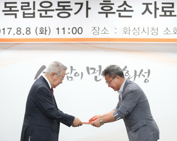 [세계로컬신문 최원만 기자] 경기도 화성시가 광복절을 앞두고 지난 8일 시청 상황실에서 ‘화성시 독립운동가 후손 자료 기증식’을 열었다.