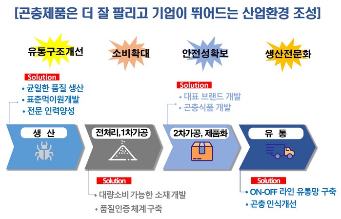 또한, 기준의 농가가 생산-가공-유통을 전담하는 농가 중심적 산업구조에서 농가는 생산을 담당하고 도는 전처리와 1차 가공, 기업은 제품화·유통을 전담하는 분야별 전문화된 산업구조 체계화해 곤충산업의 구조적 혁신을 도모한다.