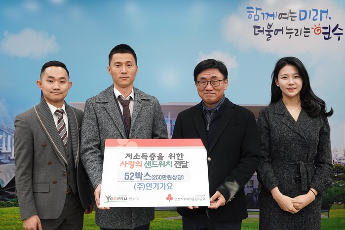 [세계로컬타임즈 장선영 기자] 연수구는 식품 프랜차이즈 업체 ‘인기가요’에서 인천사회복지 공동모금회를 통해 지역 저소득층 지원을 위한 '사랑의 샌드위치' 52박스를 기탁받았다.