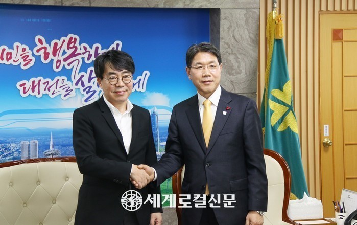 이재관 대전시장 권한대행은 14일 오후 시청 응접실에서 사이언스콤플렉스 추진과 관련해 ㈜신세계 고광후 부사장과 면담을 갖고 대전시, 신세계 등 관련 기관들과의 협상으로 사이언스콤플렉스 타워 건립 추진에 속도를 낸다고 밝혔다.