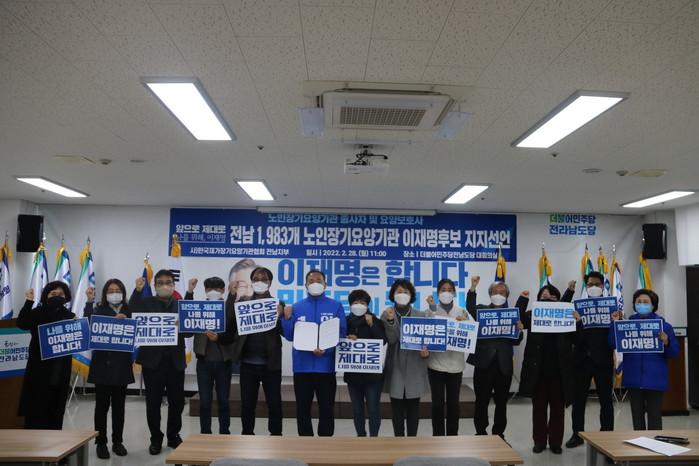 송종환 지부장은 “이번 대선에서 노인장기요양기관의 종사자 처우에 대한 정책은 이재명 후보가 유일하게 정책을 제시하고 있다”며 “전남의 노인장기요양기관 1,983개소를 대표해 이재명 후보의 돌봄국가제 공약을 적극 지지한다”고 말했다.
