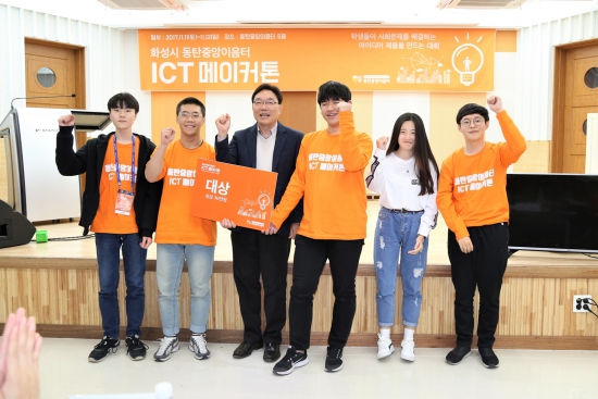 | ▲ 지난 11일부터 12일까지 경기도 화성시 동탄중앙이음터가 개최한 'ICT 메이커톤' 대회에서 대상으로 선정된 화성동탄중앙고등학교 Bold Bald팀이 기념촬영을 하고 있다. |