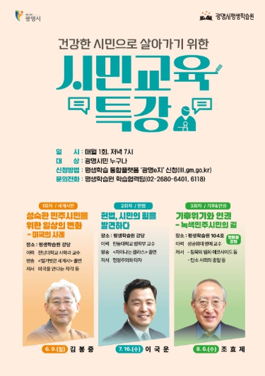 첫 강연은 6월 9일 오후 7시 광명시 평생학습원 강당에서 열린다. 강연자는 김봉중 전남대학교 사학과 교수로, ‘성숙한 민주시민을 위한 일상의 변화 – 미국의 사례’를 주제로 시민문화와 참여 사례를 통해 일상 속 민주주의 실천 방안을 함께 모색한다.