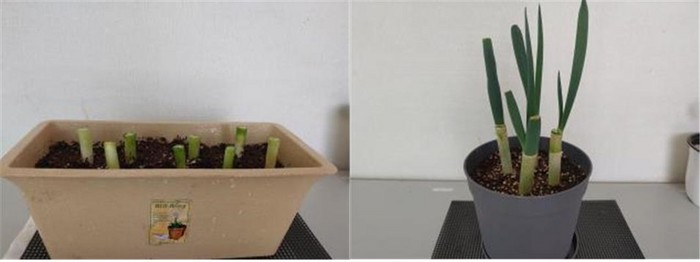 | ▲남은 대파 뿌리를 심은 모습 (사진 왼쪽)과 대파 심은 후 10일 후 모습 (사진=농업진흥청 제공) |