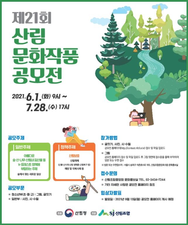 공모 주제는 ‘숲에서 찾는 새로운 일상’이라는 일반주제와 ‘산림재해 예방 및 복구, 극복사례’를 담은 산림보호 분야를 정책주제로 공모전을 운영하며, 공모 부문은 청소년부(초·중·고)는 그림과 글짓기며 일반부는 사진, 시·수필을 출품할 수 있다.
