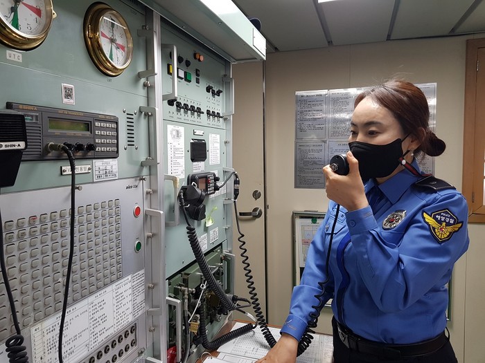 | ▲ 목포해양경찰서 3009함 이정화 경위가 해상통신을 실시하고 있다.(사진=목포해경) |
