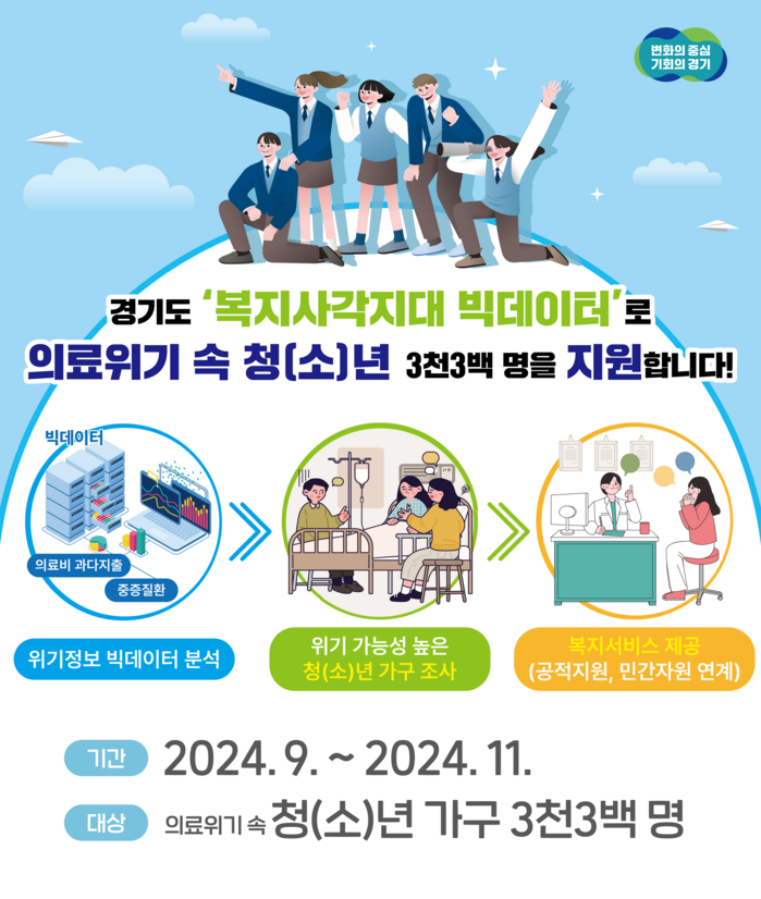 [세계로컬타임즈 = 이 호 기자] 경기도가 오는 11월까지 의료비를 과다 지출하는 등 ‘의료위기 청(소)년가구’ 약 3천300명을 조사해 복지사각지대를 발굴한다.