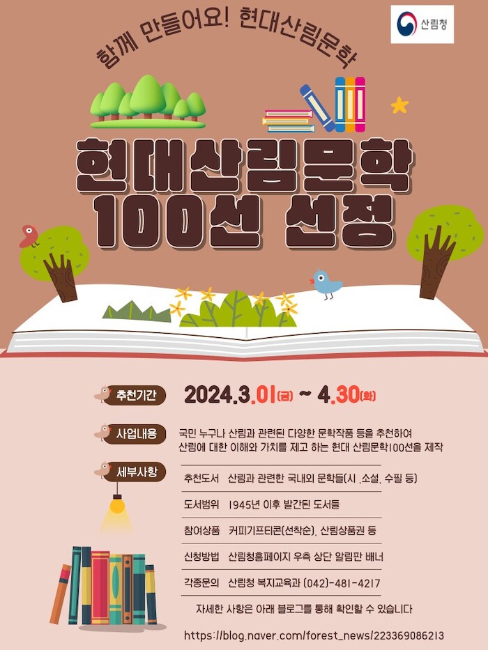4월 30일까지 산림청 누리집을 통해 참여 가능하며, 참여자 중 선착순 300명에게는 커피 기프티콘, 그 외 추첨을 통해 산림복지이용권, 산림문학지 연간 구독권 등 다양한 경품이 제공된다.