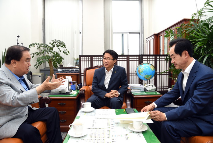 | ▲ 지난 26일 국회에서 조정식 국토위원장(중앙)에게 안병용 의정부시장(오른쪽)이 도시철도법 개정을 건의하고 있다.<사진제공=의정부시청> |