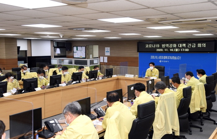 16일 시청 재난안전상황실에서 열린 긴급회의는 최근 확진자 급증과 관련해 시설별 방역 수칙 점검 및 거리두기 단계별 마스크 단속 계획 등을 세우고 이에 대한 문제점·홍보 방법·뉴딜 인력 활용 등을 논의하기 위해 마련됐다.
