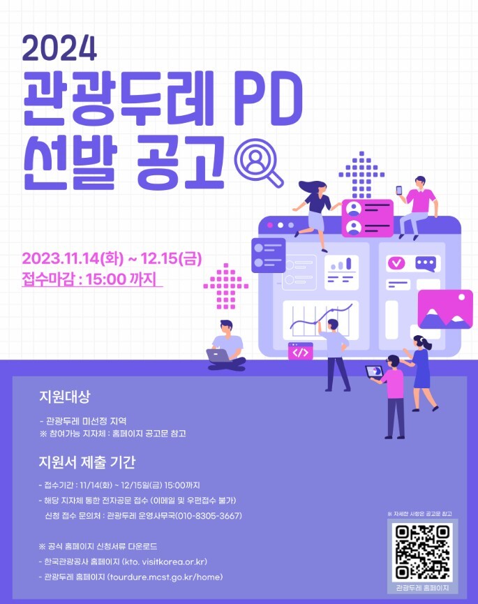 [세계로컬타임즈 이효진 기자] 문화체육관광부는 한국관광공사와 함께 14일부터 12월 15일까지 지역 고유 관광사업을 함께 만들어갈 ‘2024년 관광두레 피디(PD)’를 공모한다.