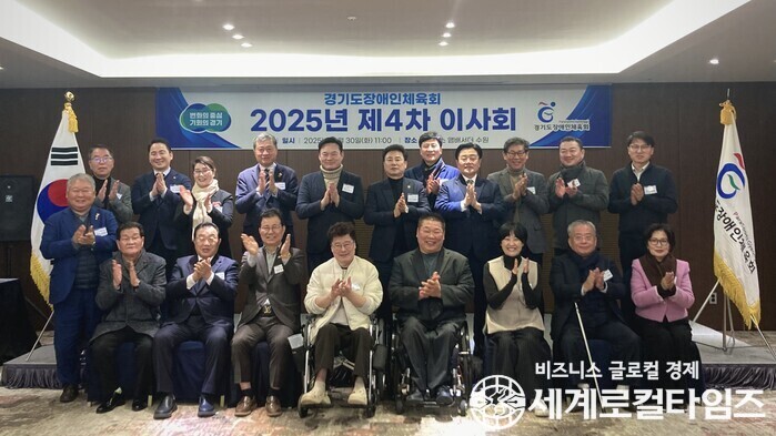 [세계로컬타임즈] 경기도장애인체육회는 12월 30일(화) 이비스 앰배서더 수원에서 2025년 제4차 이사회를 개최했다. 이번 이사회에는 경기도장애인체육회 규약에 따라 신복용 부회장이 의장을 맡아 회의를 주재하였으며, 임원 20명이 참석한 가운데 진행되었다.