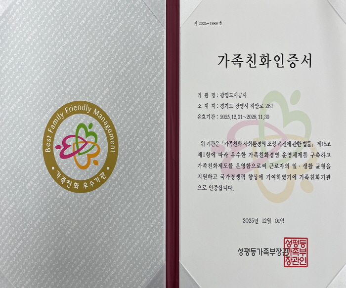 가족친화인증제도는 성평등가족부에서 '가족친화 사회환경의 조성 촉진에 관한 법률' 제15조 제1항에 의거 가족친화제도를 모범적으로 운영함으로써 근로자의 일과 생활의 균형을 지원하고 국가경쟁력 향상에 기여한 기업 및 공공기관에 대하여 심사를 통해 인증을 부여하는 제도이다. 공사는 2017. 12. 1. 최초 인증을 받았고 이번에 재인증을 획득하게 됐다.