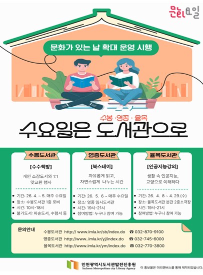 전유도 시 문화체육국장은“한 달을 기다려야 했던 문화 혜택을 매주 일상적으로 누릴 수 있도록 개편했다”며“도서관이 단순한 자료 공간을 넘어 지역의 생활문화 거점 역할을 할 수 있도록 내실 있게 운영하겠다”고 밝혔다.