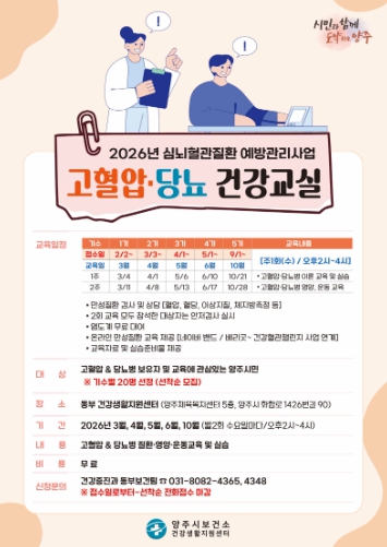 이번 교육은 만성질환 보유자와 교육에 관심 있는 시민을 대상으로 하며, 경기도 광역교육센터 표준화 교육자료를 활용해 고혈압과 당뇨병에 관한 질환, 영양, 운동 등 만성질환 전반에 대해 이론과 실습을 병행해 진행될 예정이다.