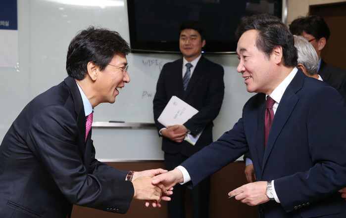 | ▲ 이낙연 전남지사가 27일 오전 서울시 중구 한국프레스센터에서 열린 지역대표축제 청년 10% 할당제 도입 및 확산을 위한 업무협약식에서 안희정 충남지사와 인사를 나누고 있다.<사진제공=전남도청> |