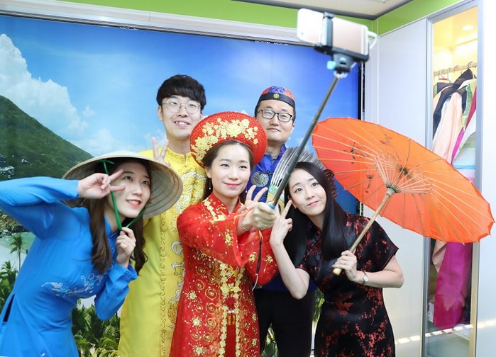 포토존은 중국의 만리장성, 세계 유명명소가 있는 대형 사진 앞에서 나라별 전통 의상을 직접 입어볼 수 있게 마련됐다.