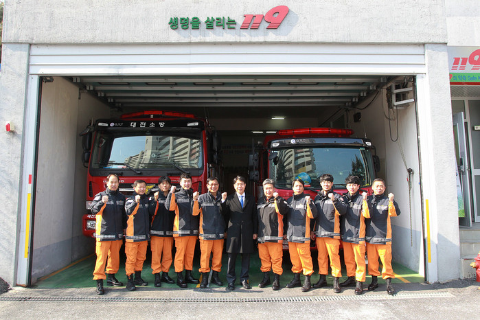 | ▲이재관 대전시장 권한대행(가운데)은 중부소방서 태평119안전센터를 방문해 화이팅을 외치고 있는 모습. |
