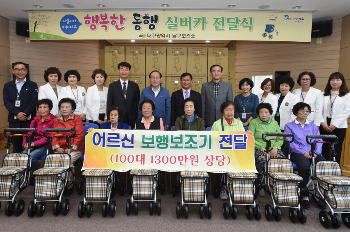 20일 대구시 남구에 따르면 (주)테크엔(회장 이영섭)이 19일 저소득층 어르신을 위해 앉아 쉴 수 있고 무거운 짐도 담을 수 있는 활동보조장비인 일명 실버카 100대를 남구보건소에 전달했다.