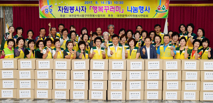 [세계로컬신문 라안일 기자]대전 중구는 14일 구청 대회의실에서 자원봉사자 50여명과 함께 ‘행복 꾸러미 나눔 행사’를 개최했다.