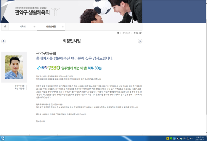 | ▲ 관악구체육회 홈페이지에 게재된 이승한 회장 인사말 화면 캡쳐. |