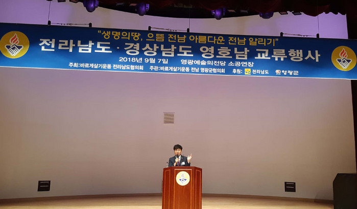 | ▲ 7일 영광군 예술회관에서 열린 바르게살기운동 영·호남 교류행사에서 주상윤 전남회장이 인사말을 하고 있다. |