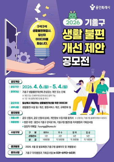 구 관계자는 “주민이 일상에서 느끼는 작은 불편이 행정 개선의 출발점”이라며 “다양한 아이디어가 실제 정책으로 이어질 수 있도록 많은 관심과 참여를 바란다”고 말했다.