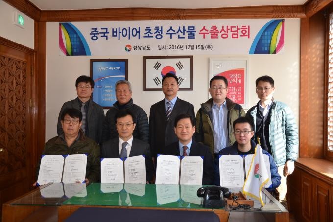 | ▲ 경남도가 지난 15일 중국 바이어를 초청해 수산물 수출 상담회를 개최한 가운데 중국 방이어와 수출계약을 맺고 단체로 기념촬영하고 있다.<사진제공=경남도청> |