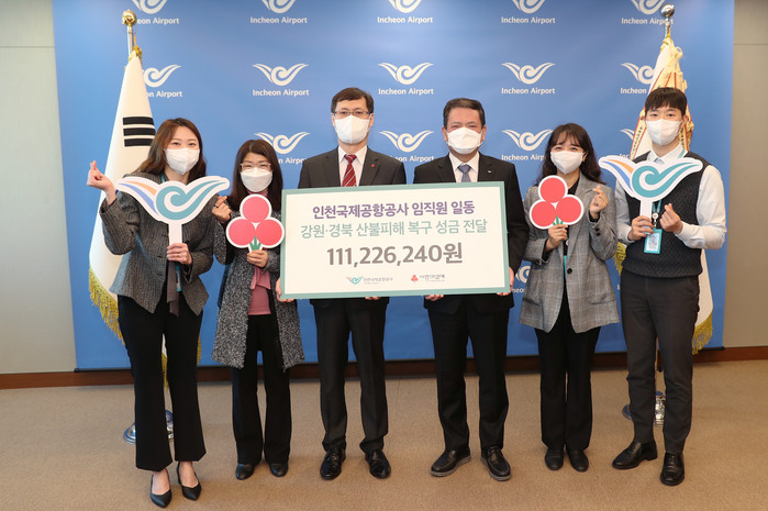 [세계로컬타임즈 한창세 기자] 인천국제공항공사(사장 김경욱)는 최근 경북‧강원 동해안 일대의 대형 산불로 인한 피해 복구 성금 1억 1천여만 원과 우크라이나 난민 구호 성금 1억 원을 각각 인천사회복지공동모금회와 대한적십자사를 통해 전달했다고 28일 밝혔다.