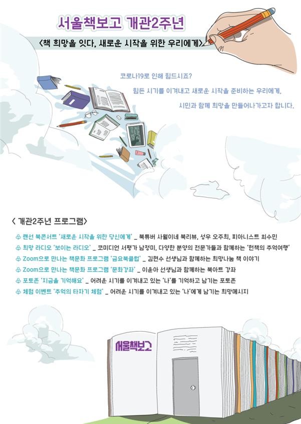 ‘책 희망을 잇다, 새로운 시작을 위한 우리에게’라는 주제로 북 콘서트, 라디오 방송, 문화강좌 등 프로그램을 온라인으로 진행한다.