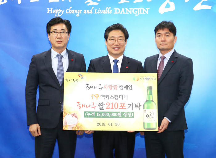 | ▲ 맥키스컴퍼니가 당진시에 540만원 상당의 해나루쌀 10kg 220포를 전달하고 있다. |