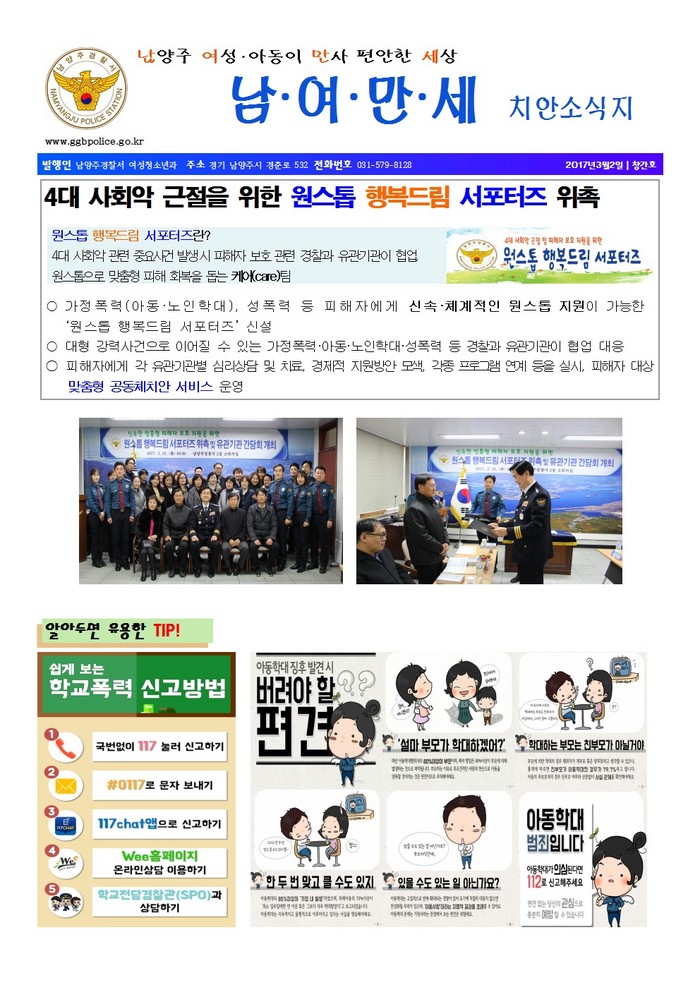 [세계로컬신문 고성철 기자] 경기도 남양주경찰서(서장 김충환)는 여성·청소년 안심 치안소식지 '남·여·만·세' 2017년 제1호를 발간했다고 21일 밝혔다.