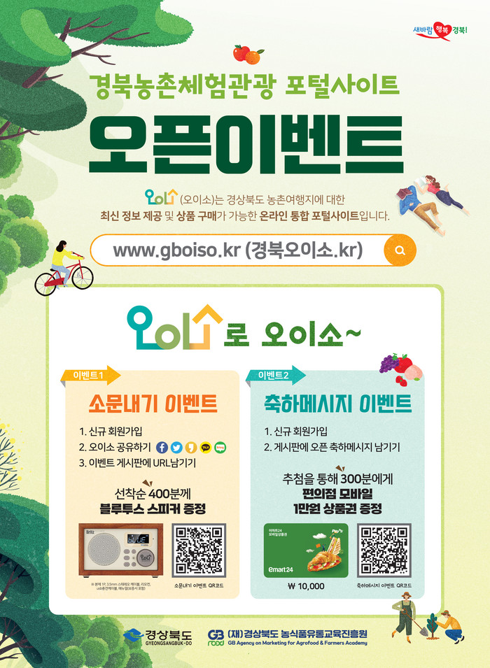 [세계로컬타임즈 이장학 기자] 경상북도는 9일 코로나19로 어려움을 겪고 있는 농촌 관광시장을 선점하고 농촌체험관광 홍보와 방문객 유치를 위해 경북 농촌체험관광 포털사이트 ‘오이소’를 오픈했다고 밝혔다.