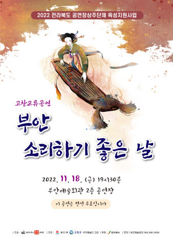 한편 이번 공연은 전북문화관광재단이 주최하고 부안군·국악예술단 고창이 주관한 2022년 공연장 상주단체 육성지원사업으로 문화예술 활성화에 기여하고자 기획됐다.