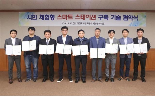 | ▲ 김민기 대전도시철도공사 사장(가운데)을 비롯해 대전정보문화산업진흥원, 대전시 소재 7개 IT기업이시민 체험형‘스마트 스테이션’구축을 위한 기술협약을 체결하고 있다. |