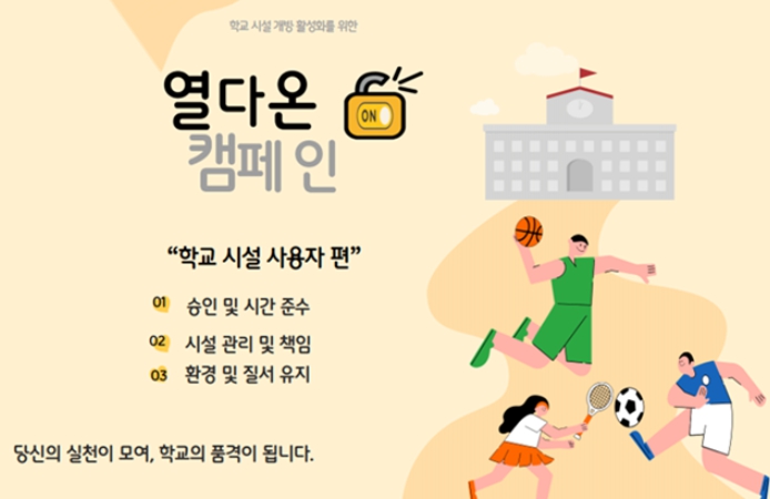더불어 학교시설에 대한 인식 개선 캠페인도 병행한다. 이용자에게는 성숙한 시설 이용 문화 확립을 위한 규칙 준수를 강조하고, 학교 측에는 사용자 책임 원칙을 안내하여, 시설 개방에 따른 관리 부담을 완화하고 자발적인 참여를 유도할 예정이다.