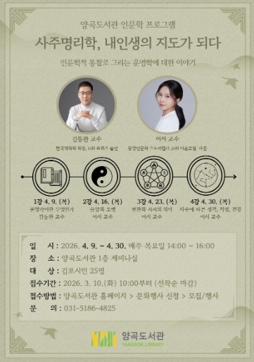 프로그램은 양곡도서관 세미나실에서 오후 2시부터 4시까지 진행되며, 김포시민 25명을 선착순으로 모집한다. 참가 신청은 3월 10일 오전 10시부터 양곡도서관 홈페이지 문화행사 신청 코너를 통해 할 수 있다.
