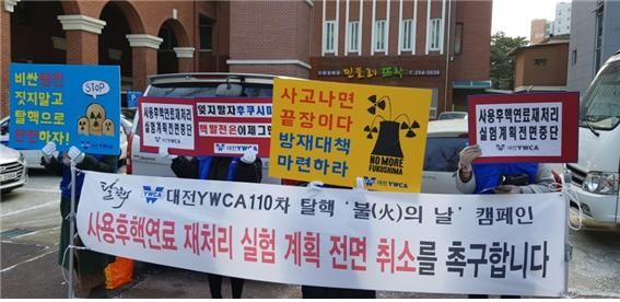 | ▲ 대전YWCA 회원들이 사용후핵연료 재처리 실험 계획 전면 취소 촉구 내용을 담은 플래카드를 들고 있는 모습. |
