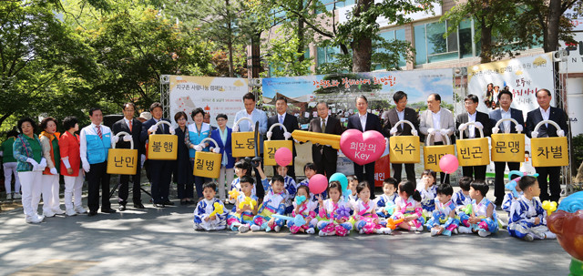 | ▲ 태백시가 2일 오후 황지연못에서 2017지구촌 사랑나눔 캠페인 사랑의 빵 모금행사를 개최한 가운데 내빈과 아이들이 함께 희망의 열쇠 돌리기 퍼포먼스를 진행하고 있다.<사진제공=태백시청> |