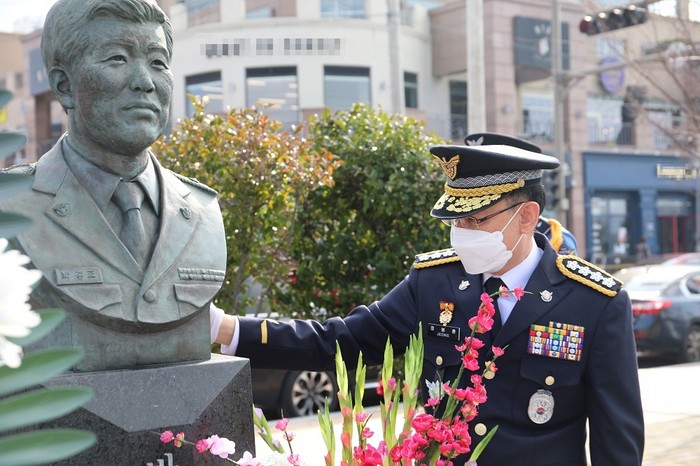 | ▲ 정봉훈 해양경찰청장이 故 박경조 경위의 숭고한 희생정신을 기리고 있다(사진=목포해경) |