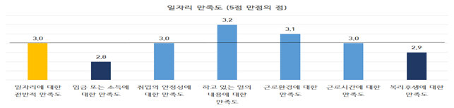 복리후생에 대한 만족도는 2.9점, 일자리에 대한 전반적 만족도는 3.0점으로 30대 3.2점, 물금읍, 면부 각 3.1점으로 양산시 평균보다 높고 장애인가구와 웅상지역이 각 2.9점으로 양산시 평균보다 낮게 나타났다.