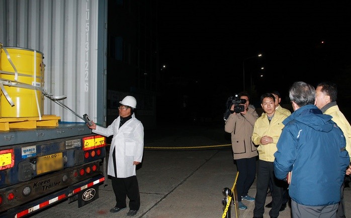 | ▲ 지난해 12월 8일 이재관 대전시장 권한대행이 중저준위 방사능 폐기물 1차분 200드럼이 경주 방사성폐기물처리장으로 운송되기 전 안전점검을 참관하고 있다. |