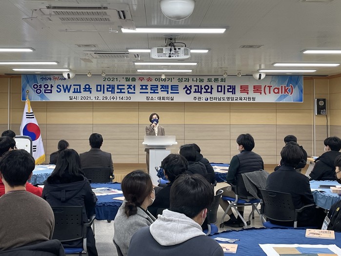 [세계로컬타임즈 강석운 기자] 영암교육지원청(교육장 김성애)은 2021년 역점사업으로 꾸준히 실시한 창의융합 SW교육 활성화를 위한 영암 미래도전 프로젝트 ‘월출 우솦 이야기’ 동아리 24팀 멘토교사와 대표학생들을 대상으로 성과 나눔 토론회를 실시했다.