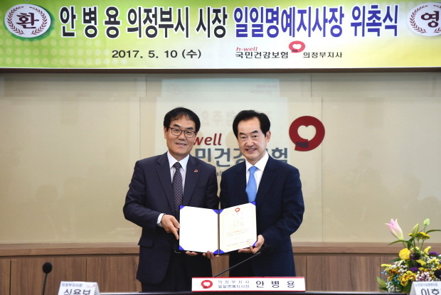 | ▲ 안병용 의정부시장(오른쪽)이 일일 명예지사장 위촉장을 받고 기념촬영하고 있다.<사진제공=의정부시청> |