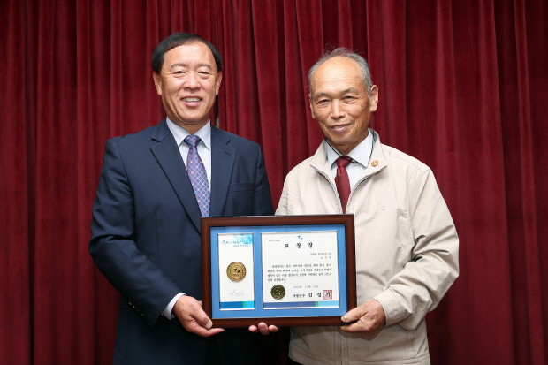 | ▲ 김성기 가평군수(왼쪽)가 10일 월례조회에서 희생과 봉사정신으로 지역사회발전에 앞장서 온 가평읍 조규종씨에게 표창장을 수여한 후 기념촬영하고 있다.<사진제공=가평군청> |