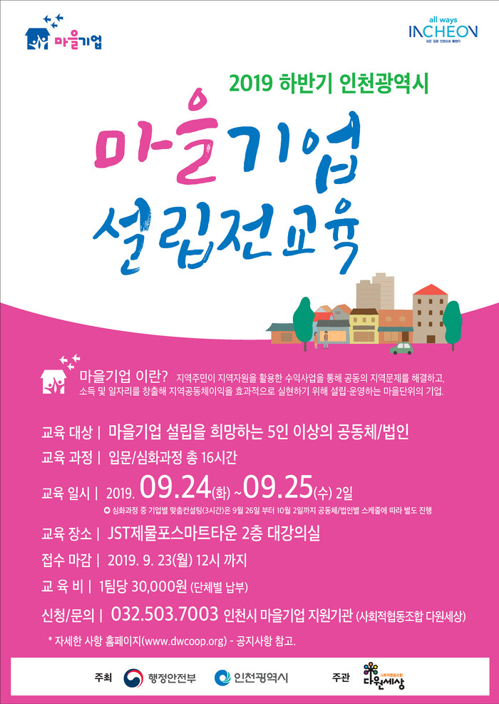 [세계로컬타임즈 박대명 기자] 인천시는 마을기업 설립을 희망하는 공동체 및 단체·법인·개인 등을 대상으로 2019 하반기 마을기업 설립전 교육을 시행한다.