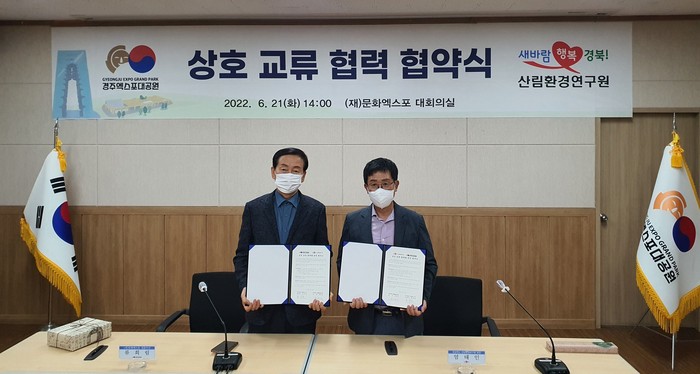 [세계로컬타임즈 이장학 기자] 경상북도 산림환경연구원은 21일 경주 문화엑스포 대회의실에서 문화엑스포와 산림자원 이용 증대 연구와 생태휴양공간 기능 다양성 유도 등을 위한 업무협약을 체결했다.