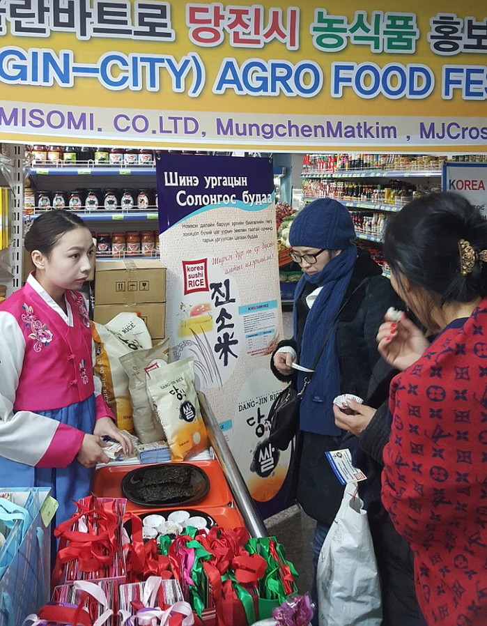 | ▲ 충남 당진시와 (주)미소미가 몽골 울란바토르에서 해나루 농특산 브랜드 홍보 및 판촉행사를 진행하고 있다. |